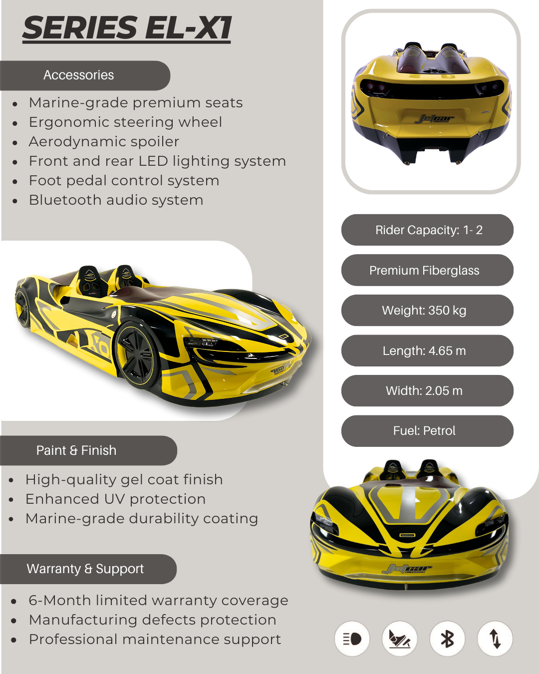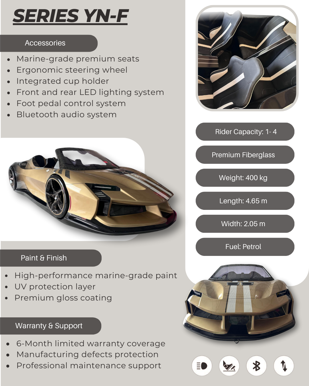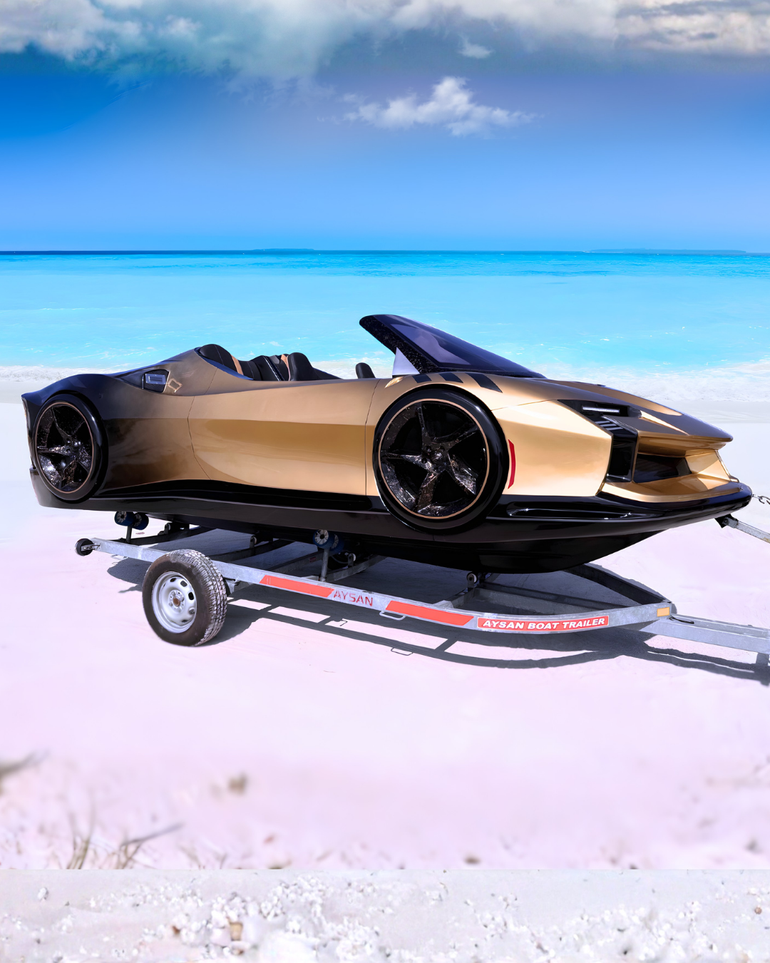 Jet car is a new Water Sports Innovation which transforms a land vehicle into a luxurious sea vessel. A fusion of luxury cars and jet skis. This fiberglass wave rider ensures an exhilarating sea journey, delivering the same speed and style of a luxury car with the unique sensation of driving on water.